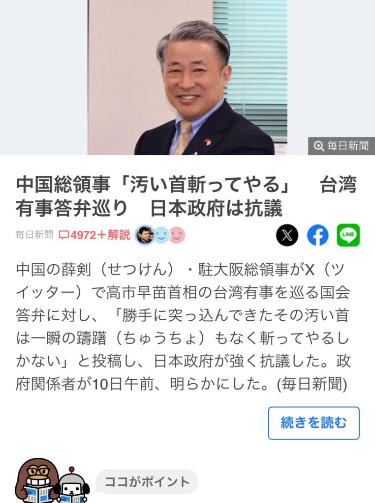中国総領事のこのコメントは流石に言い過ぎではないでしょうか。一国の首相に対して「汚い首斬ってやる」はアウトでしょう。